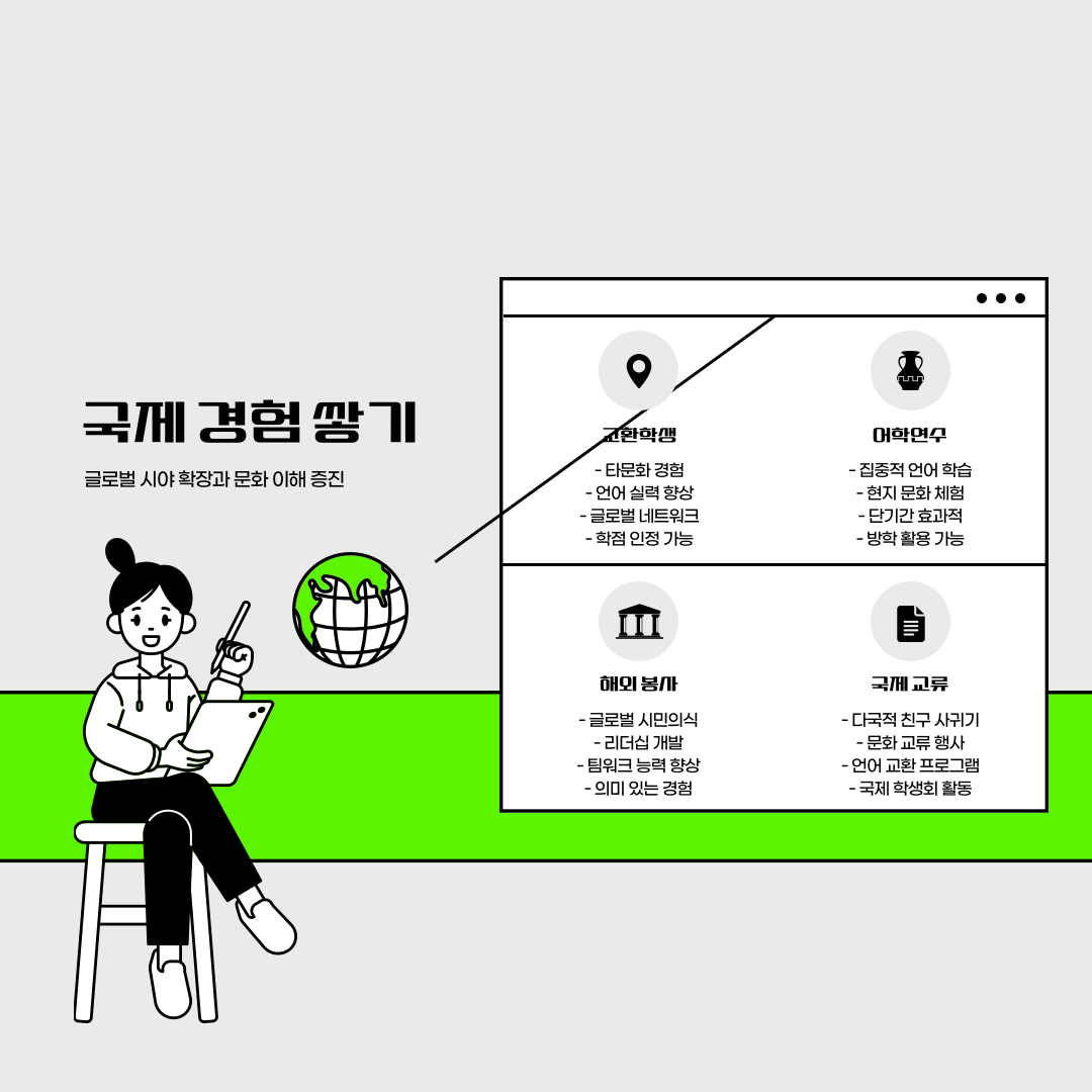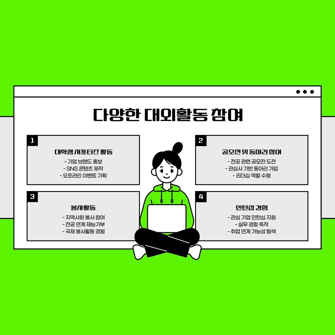 #대외활동 #서포터즈 #봉사활동 #공모전 #동아리 #인턴십 #그룹스터디 #국제교류 #어학연수 #교환학생 #해외봉사 #취업준비