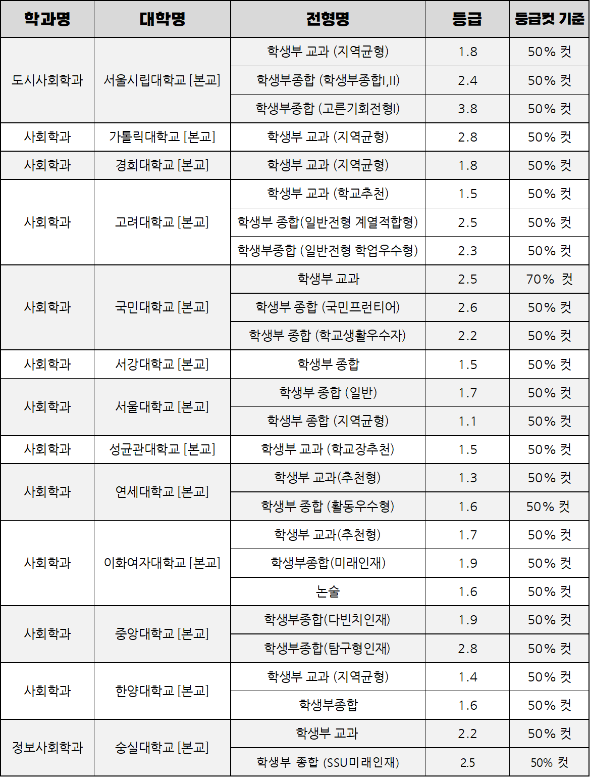 서울, 경기 소재의 주요 대학, 사회학과의 입결 자료를