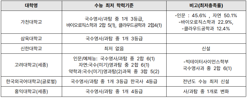 11개 대학 중 수능 최저학력기준을 실시하는 대학은 가천대, 삼육대, 신한대이다.