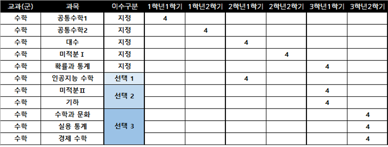 <표1> 리로고의 수학 교과 가상 편제표 : 리로고는 진로 선택, 융합 선택 중 일부만 개설함.