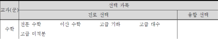 <표2> 과학계열의 수학 선택 과목² : 내용이 어려우므로 일반고에서는 거의 개설하지 않는다.