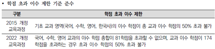 <표3> 학점 초과 이수 제한 기준 : 2015 개정 교육과정과 2022 개정 교육과정은 학점 초과 이수 제한 기준이 약간 다르다.