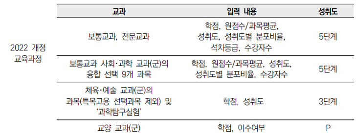 2022 개정 교육과정에서 대부분 과목은 상대평가 석차 등급(5등급)을 반영하지만 공동교육과정 개설 수업은 성취도 등급만을 반영한다.