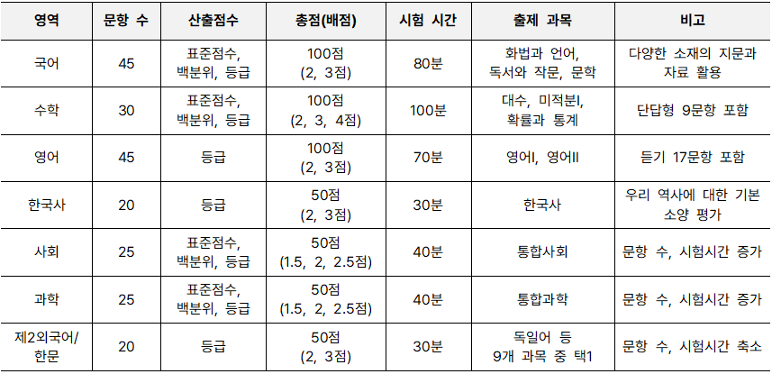[표] 2028 수능의 문항 수 및 배점, 시험 시간, 출제 범위