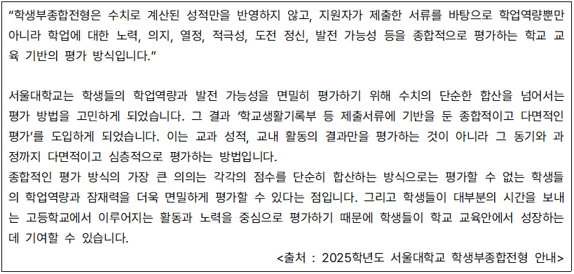학생부종합전형의 의미와 학생부종합전형이 필요한 이유에 대하여 서울대학교는 다음과 같이 정의 내리고 있다.