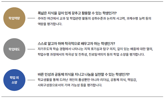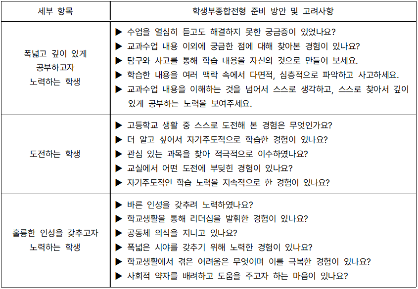 서울대는 재차 강조하지만 학생부종합전형을 평가하는 과정 속에서 폭넓고 깊이 있게 공부하고자 노력하는 학생, 도전하는 학생, 훌륭한 인성을 갖추고자 노력하는 학생들을 선호한다. 다음에 제시되어 있는 내용을 토대로 이에 대한 각각의 세부 항목들을 살펴보고 학교생활에서 학생부종합전형을 어떻게 준비해야 할지 생각해 보자.