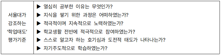 서울대는 학생들의 자기주도적 학습 경험에서 나타나는 지적 호기심, 탐구 의지, 학업에 대한 적극성 및 진취성, 과목 선택의 적극성, 진로 탐색 의지 등을 고려하여 평가하려고 노력한다. 이를 위해 교과 학습뿐만 아니라 관심 분야에 대한 적극적인 독서활동, 글쓰기, 탐구활동, 실험 수업 등 다양한 학습 경험을 살펴본다. 학교생활기록부의 교과학습발달상황, 창의적 체험활동상황, 행동특성 및 종합의견을 통해서 학생이 어떤 학업태도를 보여 왔는지 살펴보는데, 수업에서 지원자가 학업 기회를 찾아 적극적이고 지속적으로 도전했던 내용이 보인다면 지원자의 학업태도를 긍정적으로 평가한다.