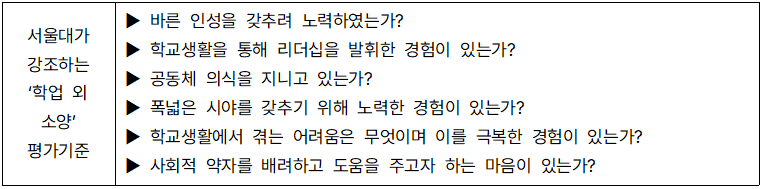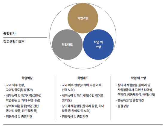 서울대는 서류평가 과정에서 위에서 살펴본 것처럼 크게 학생의 학업역량과 학업태도, 학업 외 소양에 대해 평가한다. 이때, 한 종류의 항목만으로 학생을 평가하지 않으며 제출된 학교생활기록부의 내용을 모두 반영하여 종합적으로 평가한다.