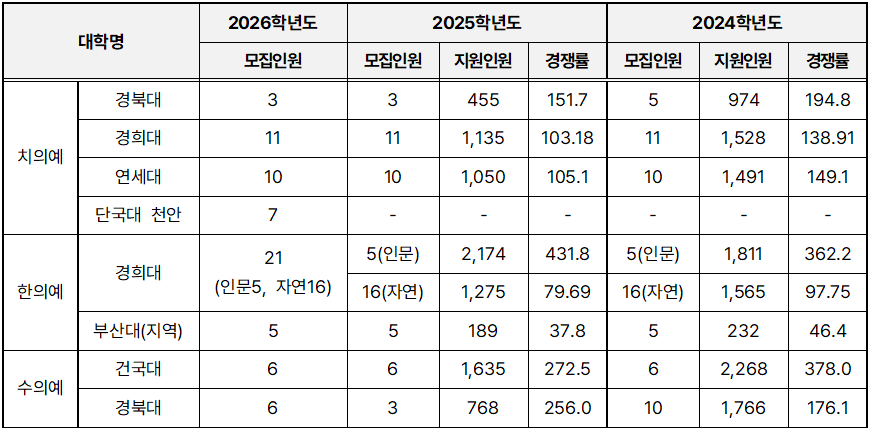 다음으로 한의예과의 경우 모집인원은 26명 그대로였지만 마찬가지로 전체 지원 인원이 30명이 감소하였다(전체 3,638에서 3,608명으로). 다만 경희대 한의학과의 경우 인문계열의 경우 오히려 지원경쟁률은 362.2 대 1에서 431.8 대 1로 증가했지만 자연계열의 경우 97.75 대 1의 경쟁률에서 79.69 대 1로 하락하였는데, 이 역시 의예과 증원과의 밀접한 연관성이 있는 것으로 보인다.