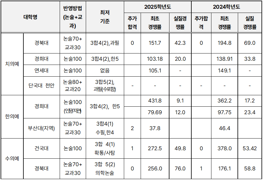 먼저 치의예과부터 살펴 보자. 경희대와 연세대는 논술 100%로 학생을 선발한다. 경북대는 논술 70 + 교과 30이다. 올해 첫 신설된 단국대는 논술 80% +교과 20%으로 학생을 선발한다. 최저기준은 3합 4(2)~3합 5(2)를 기준으로 하는데, 경북대와 단국대는 과탐 응시가 필수이다. 경북대의 경우 2024학년도 최초 경쟁률은 194.8 대 1이었으나, 최저학력기준을 충족한 경우 69.0 대 1로 낮아졌다. 마찬가지로 2025년도에는 실질 경쟁률이 42.3 대 1이었다. 경희대 역시 실질 경쟁률이 33.8 대 1로, 최초 경쟁률인 138.91 대 1에 비해 크게 낮아졌다. 올해 최초 경쟁률은 103.18 대 1이지만, 시험에 응시한 학생 중심으로 한 실질 경쟁률은 20.0 대 1로 하락한다. 하지만 추가합격은 거의 발생하지 않는다는 점도 기억해두어야 한다. 한의예과의 경우 최저 기준은 3합 4(1~2)임을 알 수 있다. 역시 최저 기준을 맞추게 되면 362.2 대 1의 경쟁률이 17.2 대 1로 떨어짐을 알 수 있다.(경희대 인문). 올해는 경쟁률은 더 높이 상승했지만, 최저 충족자 기준의 경쟁률은 9.1 대 1임을 볼 수 있다. 그러므로, 최저 충족을 하게 되면 합격 가능성이 그만큼 높아진다는 점을 알 수 있다.