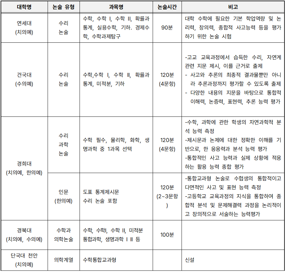 위 표를 보면 전반적으로 2024학년보다 2025학년도 전체적인 논술 지원 인원수가 선발인원이 9명이 줄었지만(68명에서 59명으로), 지원 인원은 2,954명이 줄어들었다는 사실에 주목할 필요가 있다. (총 지원인원 11,635명에서 8,681명) 이는 전년도 의예과 증원으로 인해, 치의예, 한의예, 수의예에 지원하던 학생들이 의예과의 교과 전형 또는 다른 전형으로 지원 방향을 바꾼 결과로 해석할 수 있다.