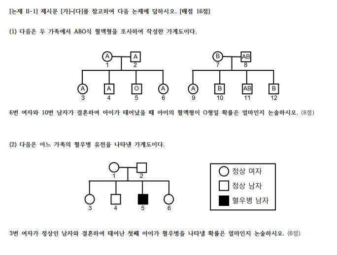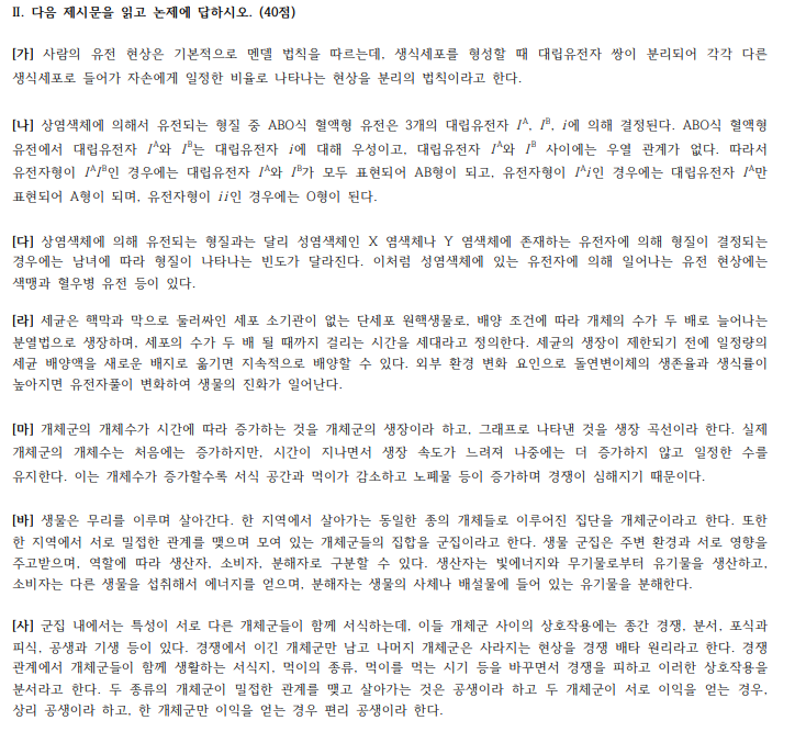 위 표에 따르면, 대부분의 대학이 수리 논술을 공통으로 실시하지만, 경희대는 과학 논술을, 경북대는 의학 논술을 실시한다. 논술 시간은 90분에서 120분 정도이다. 그렇다면 경희대학교 한의예과의 경우 인문계열과 자연 계열은 어떤 차이가 있을까? 먼저 인문계열은 수리 논술이 포함된 사회계열 논술로 출제된다. 경제 사회 관련 도표나 통계제시문을 통해 통합적이고 다면적 사고 등의 종합적 분석 및 문제 해결력 과정을 논리적이고 창의적으로 서술하는 능력을 평가한다. 반면 자연계열의 경우 수학, 과학에 관한 학생의 자연과학적 분석 능력을 측정한다. 이를 통해 통합적 사고 능력과 실제 상황에 적용하는 활용 능력을 종합 평가한다. 특히, 물리, 화학,생명 과학 중 1과목을 선택하여 자신의 역량을 평가받게 된다. 다음은 2024년도 모의논술에서 출제 되었던 예로, 총 40점으로 구성되어 있고, 제시문 (가)~(사)를 읽고 [논제 II-1](16점), II-2(24점)를 읽고 답을 하게 되는 형식이다. 반면 사회계열은 35점으로 구성되어 있다. 구체적인 내용을 살펴보자.