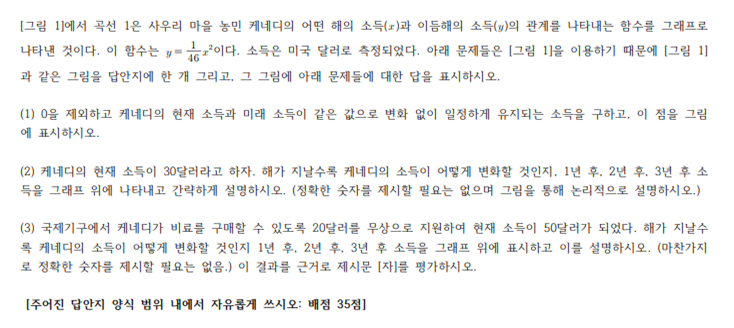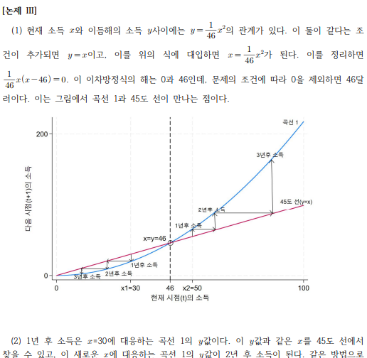 [논제 Ⅲ]은 수학 문제를 수식과 그래프를 이용해서 풀고, 주어진 제시문을 이용해서 수학 문제에 나타난 결과의 의미를 해석할 수 있는지도 평가하고자 하였다. 응시생은 문제를 통해 자료와 수학 문제의 답에 나타난 사실들을 객관적으로 파악하고, 제시문에 대한 이해를 바탕으로 자료의 사실들을 적절하게 해석할 수 있는 능력을 갖추고 있어야 한다(경희대 모의논술 해설집). 이를 통해 경희대 한의예과 자연계열과 인문 계열 논술의 차이를 확인할 수 있다.