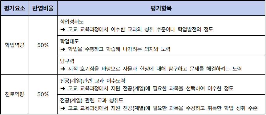 이전 글에서 경희대는 서류평가 항목이 없는 대신 교과종합평가(학생부 교과학습발달상황에 해당)와 교과, 비교과(출결, 봉사)가 혼합된 정량평가를 실시한다고 했습니다. 교과종합평가란 학교생활기록부 교과학습발달사항의 교과 성적과 세부능력 및 특기사항을 의미합니다. 입학사정관 2분이 종합적으로 정성평가하고 평가위원 간 일정 점수 이상의 점수 차이가 나는 경우 평가조정위원회를 개최하여 조정점수를 부여하는 식으로 평가 방법이 진행됩니다. 아래 <표2>에서 평가요소 및 평가항목을 살펴보도록 하죠. 학업 역량은 대학 교육을 충실히 이수하는데 필요한 수학 능력을 의미합니다. 숫자 즉 학업성취도를 가장 먼저 평가하는 것은 아무래도 성취도가 높은 학생들이 대학 입학 후에도 뛰어난 학업역량을 보이기 때문이겠죠. 학업태도와 탐구력은 숫자로 표현되는 부분의 한계가 있기 때문에 세부능력 및 특기사항에 대한 평가를 통해 이 항목을 채점한다고 보시면 됩니다. 진로역량은 자신의 진로와 전공(계열)에 관한 탐색 노력과 준비 정도를 뜻합니다. 이 부분은 해당 고등학교의 진로 트랙을 살펴볼 수도 있고 교육 과정을 들여다볼 수도 있는 부분이기에 1, 2학년 시기에 자신의 진로에 따라 선택과목을 신중하게 선택하며 대비하는 것이 좋습니다. 평가요소를 생각해볼 때 영어영문학과를 지원하는 학생이 영어 교과목의 점수가 좋지 않고 교과세특에 역량이 두드러지지 못한 경우 학업역량과 진로역량 두 부분에서 좋은 점수를 받지 못할 확률이 높겠죠.