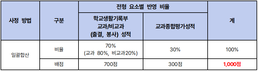 교과/비교과 반영 비율이 70% 그리고 교과종합평가 반영 비율이 30%라고 이야기를 나눴죠. 학교생활기록부 교과 반영 비율만 봤을 경우 80%, 비교과인 출결, 봉사가 각각 10%씩 비율을 차지하고 있습니다. 그리고 교과종합평가 30%를 평가한 후 이 두 전형 요소를 합산 반영하여 총점 순으로 선발합니다. 보편적으로 총점은 1,000점을 기준으로 하는 학교들이 많다는 것도 저번 편에서 살짝 말씀드렸는데요, 경희대학교의 경우 <표3>에서 보시는 바와 같이 1,000점을 만점으로 일괄합산 방식을 적용하고 있습니다.