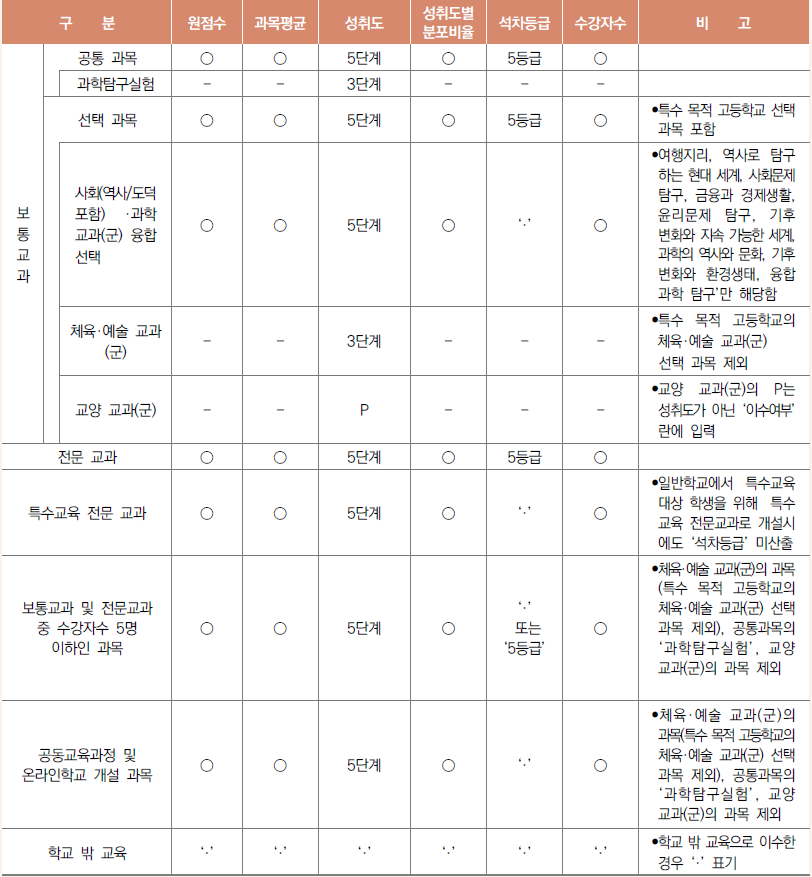 <표 1>의 구분에 따라 원점수, 과목 평균, 성취도별 분포 비율, 수강자 수 기재 여부가 다르며