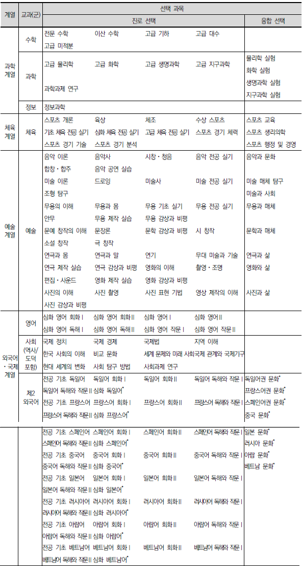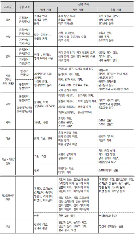 보통 교과는 과목의 성격에 따라 공통 과목과 선택 과목으로 분류한다. 공통 과목은 기초 소양 함양 및 기본 학력을 보장하기 위한 과목으로 주로 1학년에 수강한다. 선택 과목은 공통 과목 이수 후 적성과 진로에 따라 자유롭게 수강할 수 있는 과목³으로 주로 2, 3학년에 수강하고, 과목의 위계나 성격에 따라 일반 선택, 진로 선택, 융합 선택으로 나눈다.