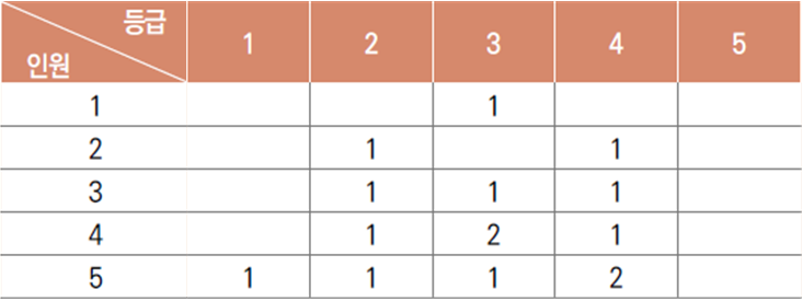 수강자 수가 5인일 때, 상위 90%까지 해당하는 4.5명까지는 4등급으로 산출해야 하므로 5등급으로 산출되는 인원은 없다.