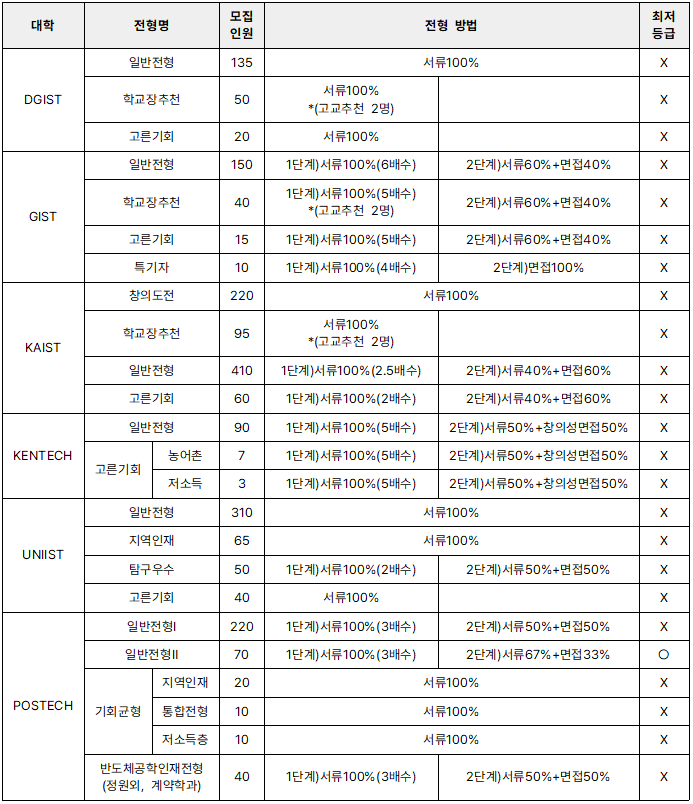 DGIST, GIST, KAIST, KENTECH, UNIST 2026학년도 입시 요강