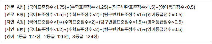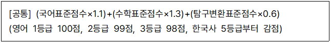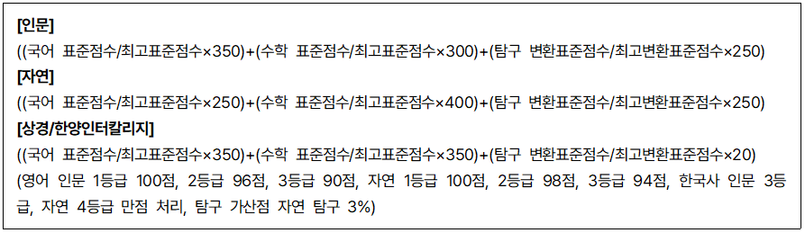 한양대는 가군 826명, 나군 269명, 다군 60명을 모집하였다. 2025 정시 환산점 산출 공식은 다음과 같다.