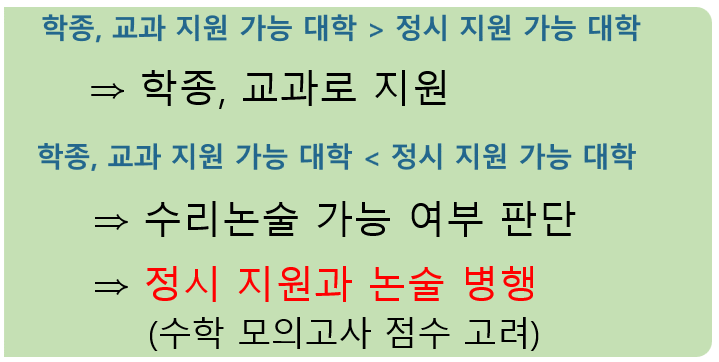 논술을 지원하는 또 다른 경우는 (자연계 논술이므로-수리논술) 다른 과목에 비해 수학만 잘 하는 경우입니다. 수학이 3등급이어도 나머지 과목이 5등급이라면 다른 과목에 비해 수학만 잘하는 경우라 볼 수 있습니다. 수리논술로 지원가능한 수학 실력은 대학에 따라 다르겠지만 마지노선 수학 모의고사 4등급 초반 정도라고 생각됩니다. 모의고사 백분위 70% 이상 정도면 약술형 논술은 합격이 충분히 가능합니다. 하지만, 이 경우도 기출문제를 충분히 풀어보고 적절한 선에서 지원을 해야지, 무작정 가고 싶은 대학에 지원하는 것은 아닙니다. 다양한 가능성을 충분히 고려한 후, ‘논술 전형에 지원하는 것이 적합하겠다’ 싶으면 이제 어느 대학에 지원할 것인지를 고민해봐야 합니다.