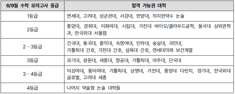 연세대, 고려대, 서강대, 한양대는 모의고사 수학 1등급이 아니면 합격이 매우 어렵습니다. 성균관대는 어렵지 않은 편이었으나 점차 난이도가 올라가고 있어 이제 모의고사 1등급 나오는 정도의 수학 실력이 있어야 한다고 판단됩니다. 그 외 대학들의 수리논술 난이도를 2025 쎈진학의 논술 합격자 데이터 분석에 근거하여, (25년 논술전형으로 합격한 학생들의 수능 수학 등급 분포도) 6월, 9월 모의고사 수학 등급으로 합격 가능한 대학들을 아래 도표로 분류해 보았습니다.