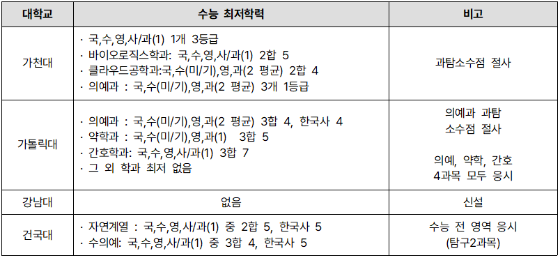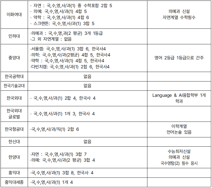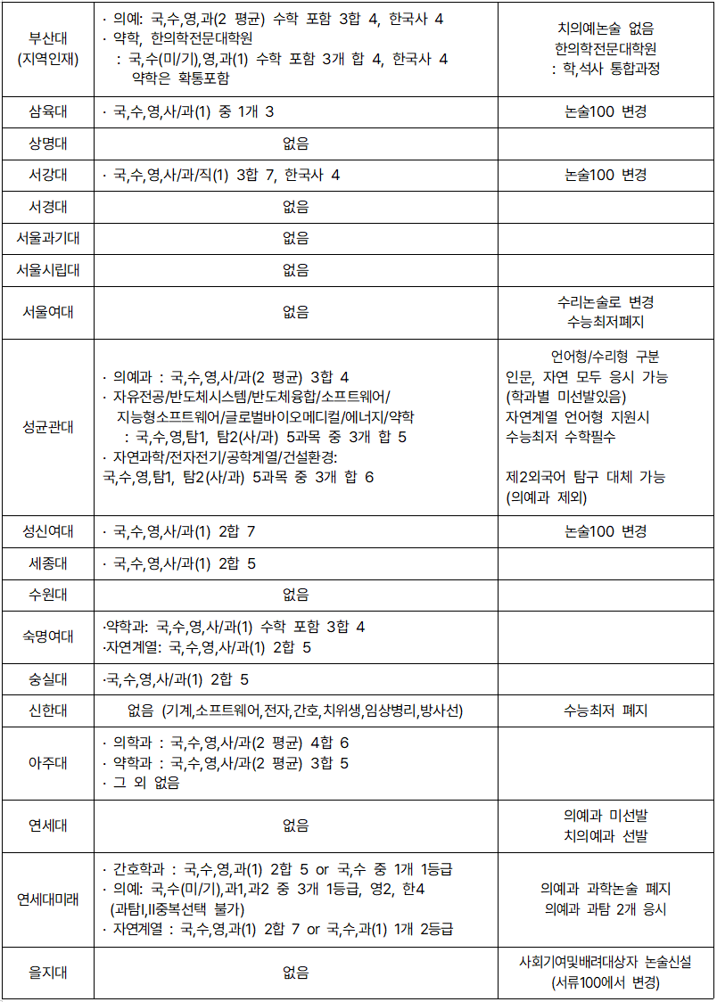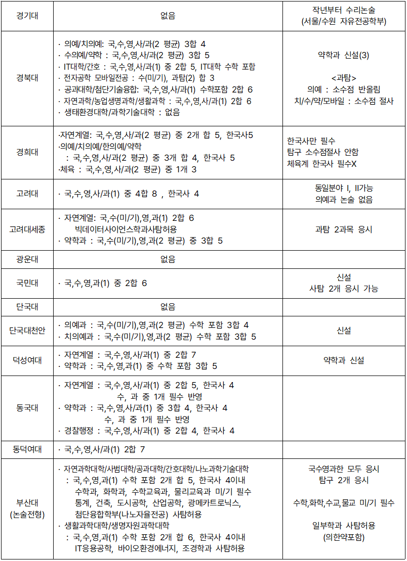 학과별로 수능 최저가 상이한 학교들이 많으니 꼼꼼하게 확인하시고, 지원하려는 학과의 수능 최저를 정확하게 파악해서 탐구에서 과탐을 필수로 요구하는지, 수학은 미적이나 기하를 요구하는지 분명하게 알고 지원해야 합니다.