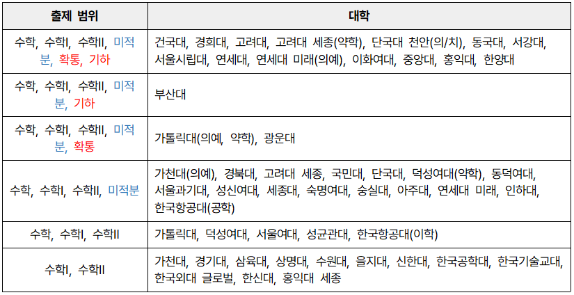 확통이나 기하를 선택하지 않았으면 확통, 기하가 출제되는 대학은 피해서 지원해야 합니다. 논술만을 위해서 확통이나 기하를 공부한다는 것은 매우 비효율적이므로, 1학년 선택과목 선택부터 사실 논술전형을 생각하고 대비를 해야한다고 생각할 수도 있습니다. 아래 표는 기하, 확통이 모두 출제되는 대학, 미적분만 출제되는 대학, 기하, 확통, 미적분 모두 출제되지 않고 수학, 수학Ⅰ, 수학Ⅱ만 출제되는 대학들을 분류해 놓았습니다. 논술 전형을 지원할 때 꼭 이것도 확인하시기 바랍니다.