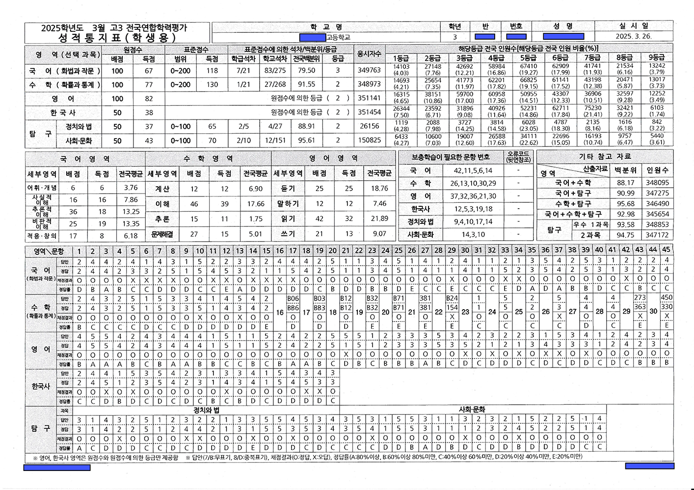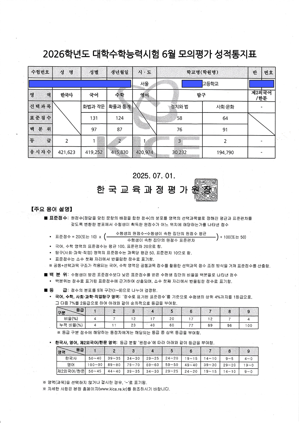 그 전에, 모의평가를 포함한 대학수학능력시험 결과에 대해 3가지 정도의 소견을 전하고 싶습니다. 우선, 대한민국 정시모집 수능 전형은 일반적인 게임의 룰에 적용되는 상식적인 과정을 거치지 않습니다. 보통 일상에서 즐기는 스포츠를 포함한 게임들은 3번의 게임 가운데, 최종적으로 2번의 결과에서 앞서면 승리를 쟁취할 수 있습니다. 그런데, 대한민국의 수능은 6월과 9월 모의평가에서 흔히 말하는 대박을 내서 2승을 쟁취했더라도, 마지막 11월 대학수학능력시험에서 어떤 이유에서든지 실패하면 패배를 인정해야 합니다. 물론 6월과 9월 모의평가는 11월 대학수학능력시험이라는 본 게임에 비하면, 연습 게임에 불과하다고 가볍게 여길 수도 있겠지만, 최종적으로 대학 지원 시 수험생의 입시 전략에 미치는 영향력과 중요성이 매우 지대한 사실은 부인할 수 없을 것입니다. 이를 통해 전하고 싶은 메시지는 6월과 9월에서 설령 만족스러운 결과가 아닐지라도 끝까지 최선을 다한다면 승리자가 될 수도 있다는 것입니다. 즉, ’마지막에 웃는 자가 진짜 승리자‘인 것이니, 지치지 말고 포기하지 않았으면 좋겠습니다. 다음으로, 지난 수능 역사 가운데, 첫해인 1994년에만 대학 진학에 적용할 수 있는 성적을 인정하는 수능을 1년에 2번 치르고, 그 뒤로는 1년에 한 번 그것도 추운 겨울에 치렀습니다. 앞으로의 인생을 좌지우지할 수 있는 중요한 시험인 수능을 1년 중, 그것도 기후 환경이 좋지 않은 시기에 딱 한 번 치르는 것입니다. 물론 수능을 치르는 모든 수험생들에게 똑같이 적용되는 룰이기 때문에 불만을 가진들 스스로에게 이로울 것도 없습니다. 그럼에도, 이날 하루만큼은 자신의 모든 역량을 최대한 발휘할 수 있도록, 평소에도 컨디션을 조절해서, 집중력과 지구력 그리고 순발력 등을 스스로 제어할 수 있어야 한다고 조언하고 싶습니다. 마지막으로, 전달하고 싶은 메시지는 수험생이 아니라, 한국교육과정평가원의 모의평가 및 대학수학능력시험 성적 결과를 담당하는 관계자에게 해당되는 내용인데, 아래 2026학년도 대학수학능력시험 6월 모의평가 성적통지표는 위에서 여러 항목들의 지표를 확인한 전국연합학력평가와 동일한 학생의 성적통지표인데, 한눈에 봐도 정말 성의(?)가 없어 보입니다. 그런데, 문제는 단순히 성의(?)가 없어 보이는 것만으로 끝나는 것이 아니라, 이 성적표 한 장으로 수험생이 다음 모의평가나 수능에 전략을 구상하는 과정에서 제공되는 자료가 지나치게 미비하다는 것이 큰 골칫거리입니다. 더욱 심각한 문제는 대학수학능력 시험의 결과도 이와 동일하게 제공된다는 사실입니다. 결국, 대학수학능력시험 성적통지표를 활용해서, 수험생 스스로가 자기 주도적으로 희망 대학 및 학과에 대한 지원 여부를 가늠하는 것은 애초에 불가능하고, 공교육의 담임 교사나 진로진학 상담교사보다는 사교육에서 상위누적백분위 등 통계에 능숙한 학원이나 컨설턴트에게 찾아가게 만드는 지경에 이르게 되는 것이 답답함을 넘어 복장이 터질 정도이니, 한국교육과정평가원에서는 수험생을 배려하는 차원에서, 과목별 백분위뿐만 아니라, 최소한 영역별 조합(국+수+탐)의 백분위라도 제공하여, 더 이상, 각 영역별 백분위를 단순하게 더한 후, 무식하게 영역 수로 나누는 지랄스러운 ’단무지(?)‘행위를 멈출 수 있기를 진심으로 바라는 바입니다.