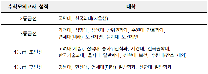 <표 1> 수학 모의고사 성적에 따른 권장 지원 대학