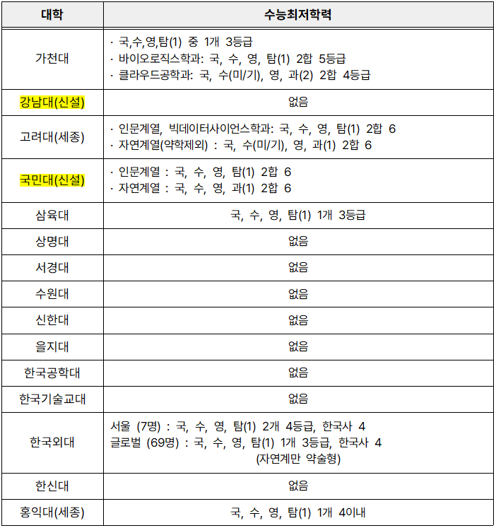 <표 2> 약술형 논술 운영 대학별 수능최저학력 기준