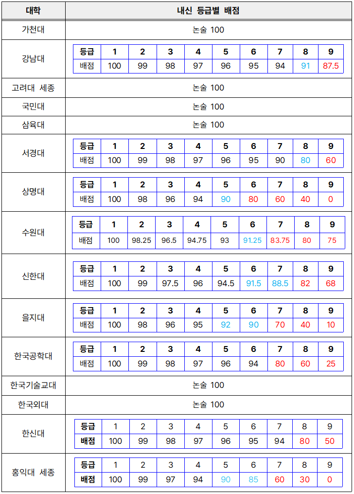논술 100%를 반영하는 대학들이 많이 증가하고 있습니다. 하지만 여전히 내신 성적이 반영되는 대학이 있고, 약술형 논술은 그래도 내신을 후하게 봐주고 있습니다만, 그래도 불안하다면 아래 표를 살펴보고 지원하면 좋겠습니다.