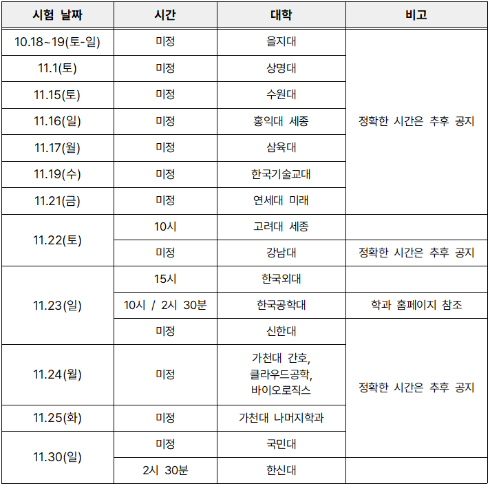 고려대(세종)과 강남대가 동일한 일자, 한국외대, 한국공학대, 신한대가 동일한 일자, 국민대와 한신대가 동일한 일자에 시험을 치릅니다. 시간이 아직 확정이 안된 대학들이 많으니, 추후 홈페이지에 공지되는 시험 시간을 확인하시고, 대학 간의 거리가 너무 멀지 않으면 오전, 오후로 두 번 시험을 치를 수도 있으니 참고하시기 바랍니다.