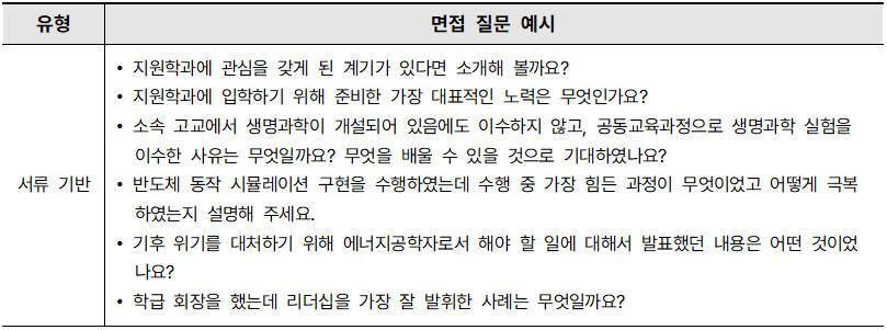 서류 기반 면접은 학교생활기록부에 기록된 지원자의 활동을 확인하고, 활동의 진위 여부를 판단하는 것뿐만 아니라 기록된 활동을 왜 했는지, 어떤 활동이었는지, 그 경험을 통해 지원자가 어떤 성장을 하게 되었는지 등을 확인하는 것을 목적으로 한다.