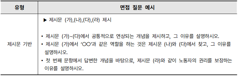 제시문 면접은 제시된 주제에 대한 지원자의 분석・추론 능력, 관점, 가치관 등을 평가하는 것을 목적으로 하고, 서울대, 연세대, 고려대, 성균관대, 한양대 등 일부 대학과 일부 의과 대학에서 실시하고 있다. 면접 대기실에서 제시문과 문제를 받으면 준비 시간 동안 제시문을 읽고 문제에 대한 답변을 준비한 뒤, 면접실에서 답변하는 형태로 면접이 진행된다.
