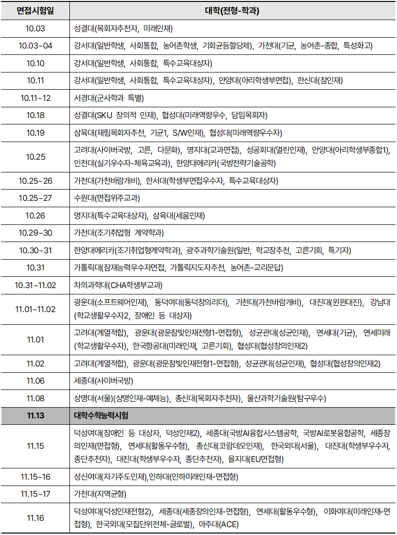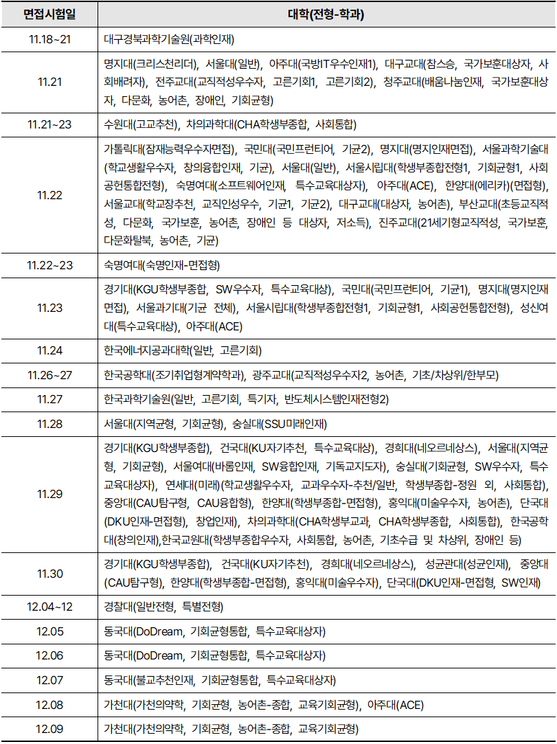 면접은 크게 수능 전에 보느냐, 수능 이후에 보느냐로 나눌 수 있다. 면접 일정 확인은 면접 준비의 시작이라 할 수 있는데, 유의해야 할 점은 1차 합격 발표가 나고 바로 면접을 실시하는 대학들이 있다는 것이다. 보통 1차 합격을 확인한 뒤 면접을 준비하고자 하는데, 1차 합격자 발표일과 면접일이 가깝다면 발표 전부터 면접을 준비하는 것이 필요하다. 따라서 지원한 대학의 1차 합격자 발표일과 면접일을 확인한 뒤 면접 준비 계획을 세우는 것이 중요하다.