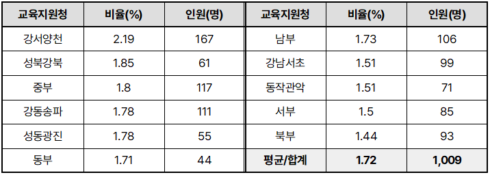 <표 1> 서울시 교육지원청별 전 과목 1등급 학생 비율과 인원-진선미 국회의원실