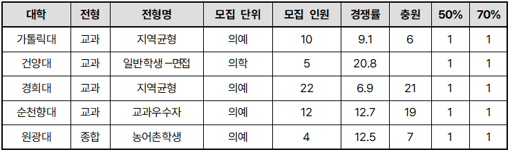 9등급제에서도 소위 ‘의치한약수’는 최상위권 학생들이 경합하기에 동점자가 나오는 상황이 많이 생깁니다. 다음은 2025학년도 입시에서 5개 대학의 의대에서 동점자들이 합격한 사례로서, 최종 등록자 50% 커트라인과 70% 커트라인이 모두 1등급입니다.