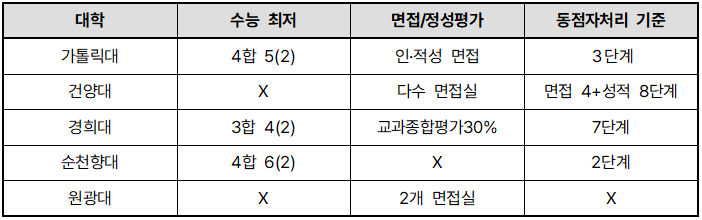 학생부교과전형인데 수능 최저학력기준(이하 수능 최저)이 없는 건양대는 동점자 처리 기준이 매우 촘촘합니다. 순천향대는 면접이 없고 동점자 처리 기준도 2단계에 불과하지만, 높은 수능 최저가 특징입니다. 경희대는 상대적으로 수능 최저가 낮고 면접 대신 ‘교과종합평가(정성평가)’를 활용하며 동점자 처리 기준을 7단계로 세분화했습니다. 학생부종합전형인 원광대는 수능 최저나 동점자 처리 기준 없이 면접만으로 변별했습니다. 의대 사례이기는 하지만, 전 과목 1등급인 지원자들이라도 충분히 변별하여 선발할 수 있음을 보여주는 사례입니다.