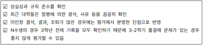 최근에는 학교에서 결석이나 지각과 관련하여 사유를 다 작성을 해주기 때문에 대학은 이 부분을 기본적으로 살펴보려고 하고, 고등학교 생활을 정상적으로 잘한 학생들을 뽑고자 노력한다. 이에 미인정 결석이나 결과, 조퇴가 많은 경우에는 평가에서 분명한 단점으로 작용하기 때문에 3학년 2학기까지 출결에 신경을 써야 한다.