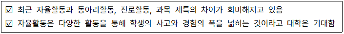 최근 학교생활기록부에서 보여지는 모습은 자율활동, 동아리활동, 진로활동, 과목별 세부능력 특기사항의 차이가 많이 희미해지고 있다는 점이다. 세특에서 탐구한 주제를 바탕으로 자율활동에 활동을 연계하고, 어떤 과목에서 조금 더 확장시켜 활동을 이어가는 등 여러 영역에 연계되면서 영향력이 나타나는 것들이 보이기 시작한다고 대학은 이야기한다. 하지만 대학은 자율활동의 내용만을 보고 학생의 역량이 매우 뛰어나다고 생각하지는 않는다. 자율활동에서 탐구한 내용과 관련한 과목의 성적과 세부능력 특기사항의 내용과 결과를 살펴보고 종합적으로 판단하려고 노력한다. 수학 과목에서 자율활동을 통해 어려운 심화 내용을 탐구한 학생이 수학 성적이 낮으면 해당 탐구 내용에 신뢰성을 높게 두지는 않는다. 이러한 부분은 상위권 대학일수록 크게 반영한다는 사실을 잊어서는 안된다. 결국 학교의 자율적인 운영 시스템으로 연계되어 심화된 탐구를 해 나가는 것은 좋지만 그 탐구 내용에 대한 명확한 근거가 있어야 된다는 점을 잊지 말기 바란다. 또한 대학은 대학 와서 배울 것에 대한 관심이나 학생이 수행한 탐구 방법을 궁금해한다. 대학에 와서 배울 것에 대해 얼마나 깊이, 얼마나 많이 알고 있느냐는 그렇게 중요하게 생각하지 않는다.