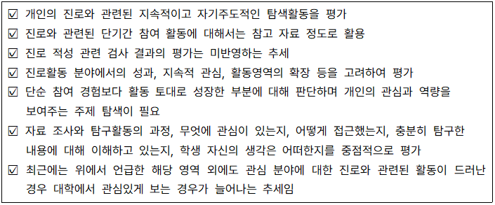 진로활동에서는 진로와 관련한 단기간에 이루어진 활동들은 참고 자료로만 활용하며, 적성검사의 내용들은 크게 반영이 되지 않는 추세이다. 진로활동에서 대학이 궁금한 내용은 개인의 관심과 역량을 보여주는 주제를 탐색했는가?, 자료 조사 과정과 탐구 활동 과정은 어떠했는가?, 무엇에 관심이 있고 어떻게 접근했는가?, 충분히 이해하고 있는가?, 학생의 생각은 무엇인가? 등이다. 학생이 어떤 계기로 진로활동을 했을 때 이 학생은 어떤 학문 분야에, 어떤 부분에 관심이 있는지를 대학은 확인할 수 있다. 또한 대학은 학생이 가지고 있는 진로역량을 진로활동에서만 찾는 것이 아니라 학교생활기록부 전반에서 찾으려고 한다는 점을 잊지 말아야 한다.