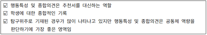 행동특성 및 종합의견은 추천서를 대신하는 역할이며, 학생에 대한 종합적인 기록으로 인식한다. 해당 내용도 최근에는 탐구 위주로 기재된 경우가 많이 나타나고 있지만 행동특성 및 종합의견은 공동체 역량을 판단하기에 가장 좋은 영역이라는 점을 잊지 말아야 한다. 대학에서 공통으로 생각하는 공동체 역량의 기본적인 요소인 나눔과 배려, 소통과 협업, 성실성과 규칙 준수, 리더십의 측면이 행동특성 및 종합의견에 잘 드러나도록 학교생활을 충실히 해주길 바란다. 대학마다 차이가 있지만 많은 대학들이 서류를 평가할 때 행동특성 및 종합의견을 제일 먼저 살펴보는 경우가 많다. 이 영역을 통해 어떤 학생인지를 미리 파악하고 이후 교과를 본 후 다른 영역들을 함께 판단하려고 한다.