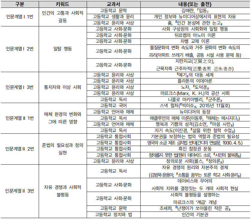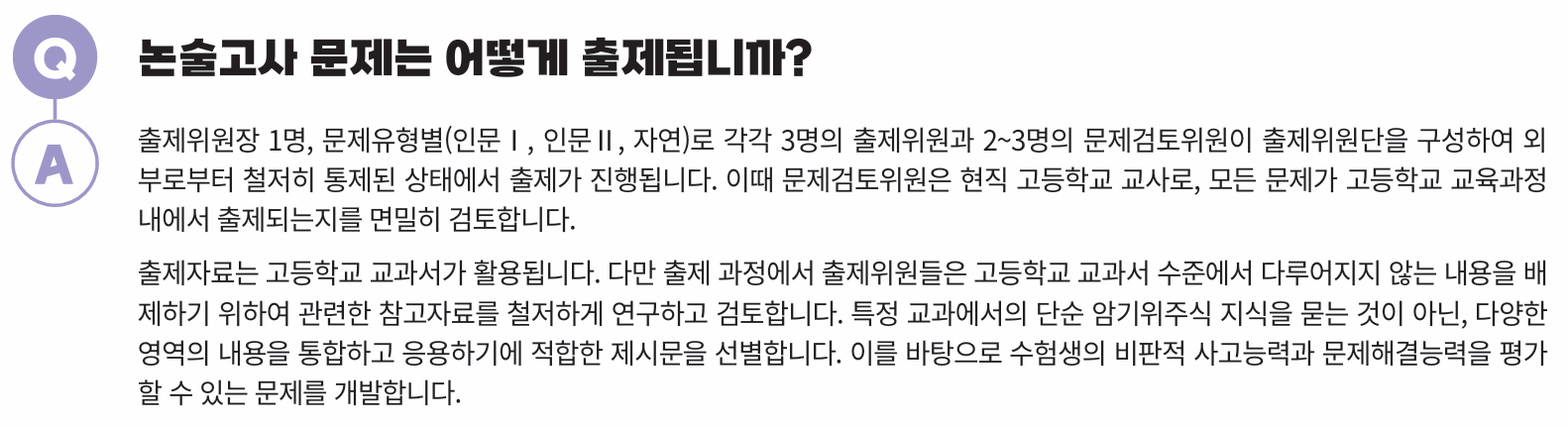 대학에서 논술 문제는 고등학교 교육과정 내에서 출제되어야 하기에 현직 고교 교사들의 검토를 거치며 출제 자료로 고등학교 교과서가 활용된다. 따라서 논술 전형에 도전하는 수험생들도 교과서를 충실히 보아야 한다. ‘나는 논술로 대학 갈 거니까 학교 수업은 소홀히 해도 괜찮아.’라는 생각이 통하지 않는 이유다. 동국대 논술 가이드북에서도 출제 위원들은 고등학교 교과서 수준에서 다루어지지 않는 내용을 배제하고자 철저히 연구하고 검토하고 있음을 밝히고 있다. 동국대는 인문 논술 지문을 2021학년도부터 2025학년도까지 5년 연속 교과서에서만 출제한 바 있다.