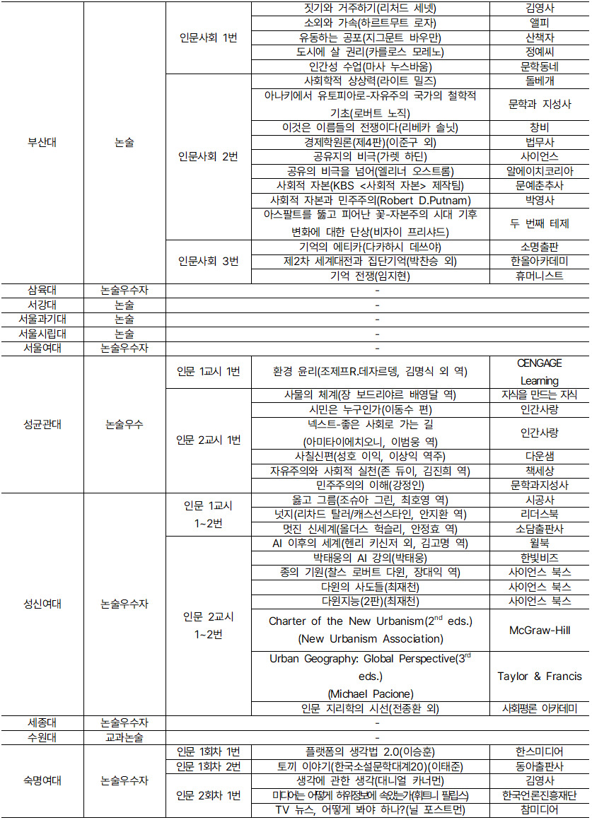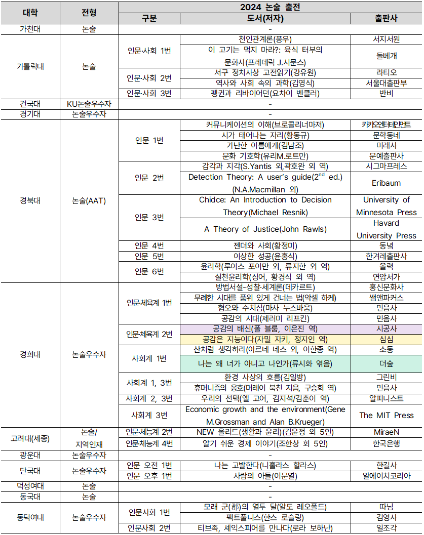 앞서 언급했듯, 논술고사에서는 교과서 내 자료를 출제하는 경우가 많지만, 교과서 외 자료를 활용하는 경우도 있다. 교과서 외 지문은 평소 다양한 분야의 독서를 통해 대비할 수 있다. 이때 참고할 수 있는 자료가 논술고사의 출전이다. 논술고사의 출전은 대학별고사 기출 문제집 격인 선행학습 영향평가 보고서나 논술 가이드북을 참고하면 파악할 수 있다. 2026학년도 논술 가이드북은 아직 다 나오지 않았으므로, 2025 논술 전형 실시 대학을 기준으로 2024 교과서 외 논술 출전을 살펴보면 다음과 같다. 수험생들은 이들 출전을 논술 전형은 물론, 수시 학종을 대비하기 위한 일종의 필독서 목록으로 활용할 수 있다.