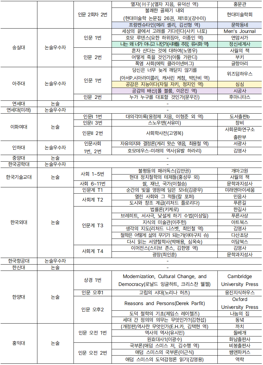 ※ 교과서 외(EBS 도서 제외) 출전 없는 대학: 가천대, 건국대, 경기대, 광운대, 덕성여대, 동국대, 삼육대, 서강대, 서울여대, 세종대, 연세대, 연세대(미래), 중앙대, 한국항공대, 한신대