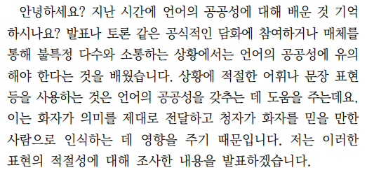 문제 유형의 차이점은 최근 2025학년도 수능과 비교하되, 예시문항 순서에 맞게 화법, 언어, 독서, 독서와 작문 복합 순으로 진행하도록 하자. 작문과 문학의 경우 이전에 나오던 수능 문항들과 거의 다르지 않기에 제외한다. 먼저 화법의 경우 예시문항의 경우 흥미롭게도 함께 묶인 과목인 언어를 주제로 잡고 있다. 화법과 언어라는 과목에 맞추어 앞으로도 언어에 대한 내용이 주제가 될지 더 지켜봐야 한다.