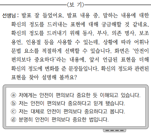 문제 유형의 경우 2번까지는 크게 변경된 것이 없지만 3번 문제가 유형이 크게 바뀌었다. 기존 화법 문제의 경우 학생의 반응을 중심으로 판단하는 문제였으나 예시문항의 경우 지문에 주어진 언어 개념을 이해하고 적용하는 문제로 바뀌었다. 이해 적용으로 난이도가 올라갔다는 점에서 이러한 문제 내용 적용을 묻는 문제가 앞으로도 나올 것으로 예상된다.