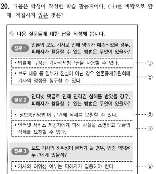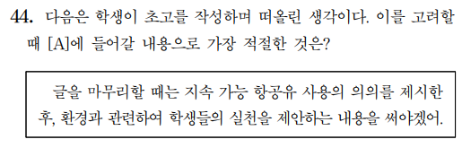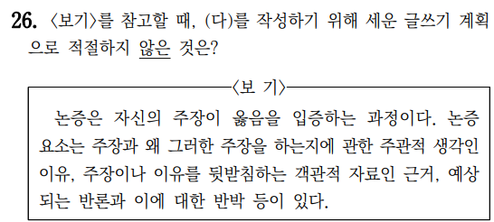 다만 26번과 27번 문제를 주목할 만한데, 26번 문제의 경우 이전에는 따로 등장하지 않은 유형의 문제다. 풀이 방법이 내용 일치를 확인하는 것뿐만 아니라 (다)의 입장이 무엇인지, 어떤 주장에 어떤 근거를 어떻게 활용하였는지, 글의 흐름과 구조 전체를 묻고 있기에 내용에 대한 명확한 이해가 필요하다. 답안은 내용 일치 수준에 그쳤지만 고난도 문제를 낼 경우 주장과 근거를 불일치시켜 내용이 지문에 있더라도 인과 관계가 틀린 선지가 나올 가능성이 크다.