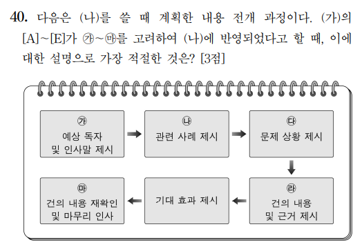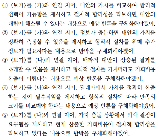 27번 문제의 경우, 문항과 선지에 주목할 필요가 있는데, 이전에 단순한 비교하기 문제였던 초고 고쳐 쓰기 방식을 [A]를 더 구체화하는 방향으로 출제하였다. 특히 (가), (나), (다), <보기> 전체가 판단 지점이 되어 매우 복잡한 문제 풀이 과정이 필요하다는 점에서 앞으로 고난도 유형에 반드시 들어갈 유형으로 판단된다. 먼저 선지들의 마지막 부분을 보면 ‘예상 반론’과, ‘반박’이 나오는데 이를 통해 [A]의 내용이 예상 반론과 그에 대한 반박으로 구성되었다는 것을 알아야 한다. 또한 <보기>의 핵심 내용이 절차적 합리성, 즉 내용보다 형식에 치중을 두고 있다는 것을 파악하여야 한다. 이를 통해 선지에 절차적 합리성, 혹은 형식적 절차를 긍정하는 내용이 포함되어야 한다. 마지막으로는 (가), (나)의 내용이 선지에 맞게 각각 포함되어 있는지 파악해야 한다.